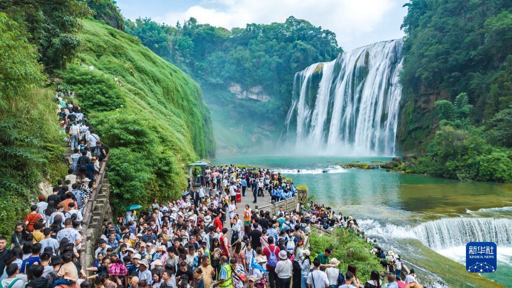 10月3日,游客在貴州省安順市黃果樹(shù)瀑布景區游玩(無(wú)人機照片)。