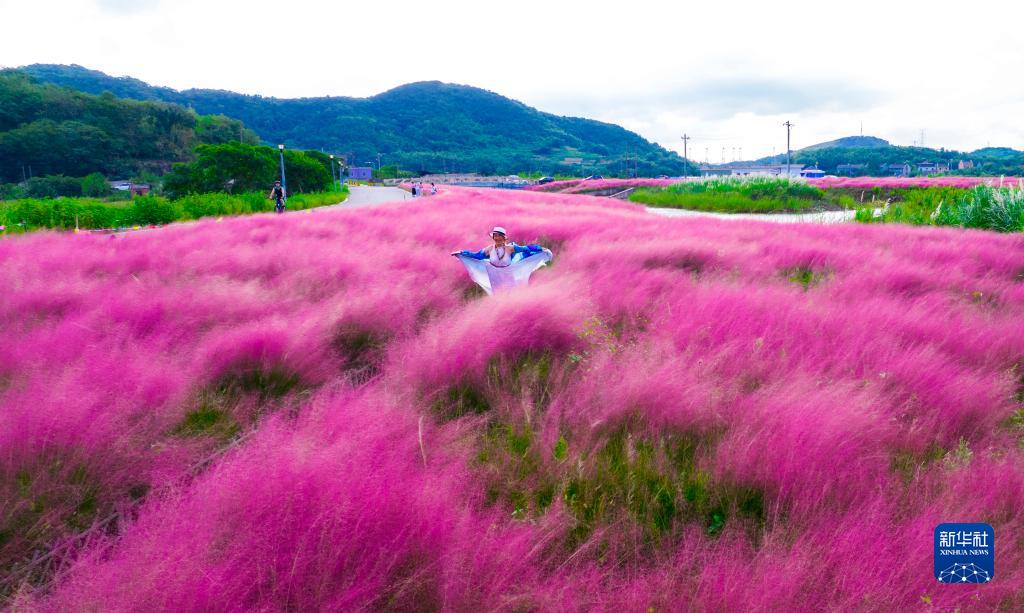 10月4日,在浙江省寧波市北侖區梅山街道梅山灣水道沿線(xiàn),游客在粉黛亂子草中游玩(無(wú)人機照片)。