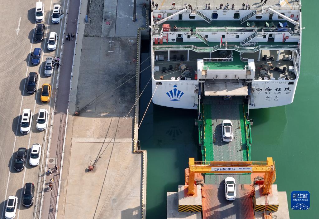 10月6日,在山東港口煙臺港,跨越渤海海峽的車(chē)輛駛入煙臺至大連的客滾船(無(wú)人機照片)。