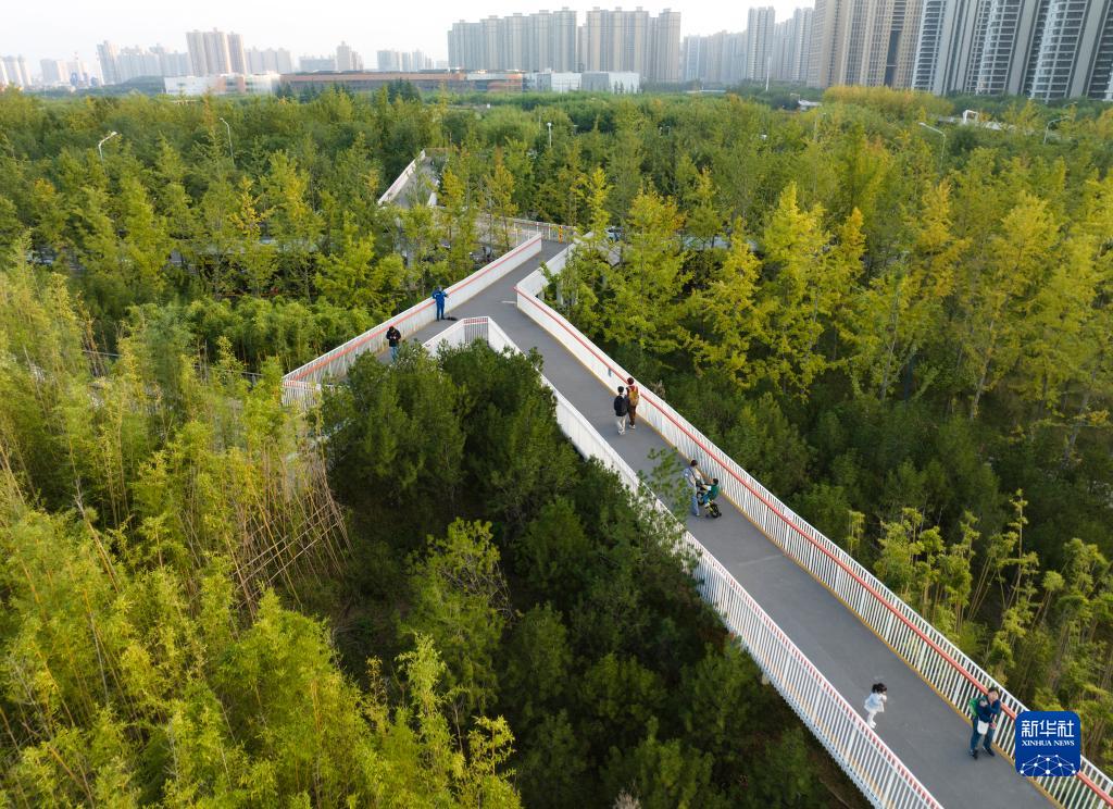 10月7日,市民在西安雁南公園內散步(無(wú)人機照片)。