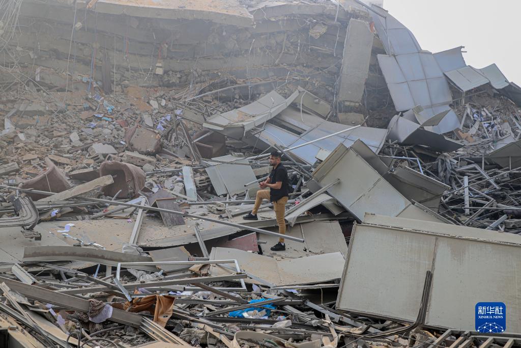 10月8日,在加沙城,巴勒斯坦人查看以色列空襲后的建筑廢墟。