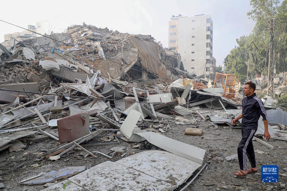 10月8日,在加沙城,一名巴勒斯坦人站在被以色列空襲炸毀的建筑旁。