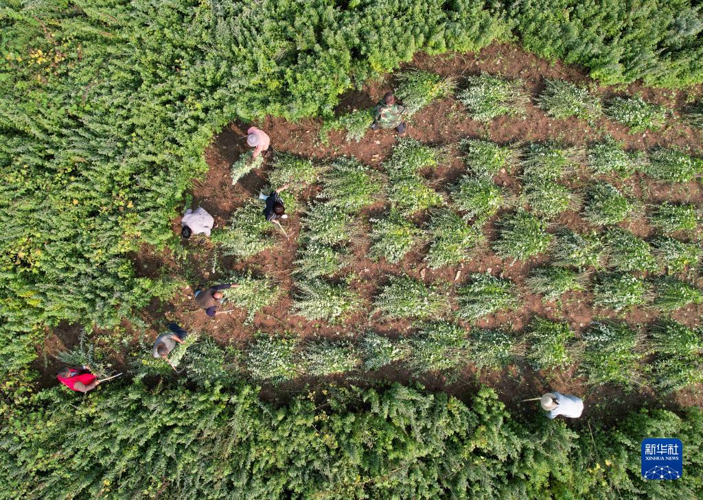 10月8日,農民在山東省臨沂市沂南縣銅井鎮杜山村艾草種植基地收割艾草(無(wú)人機照片)。