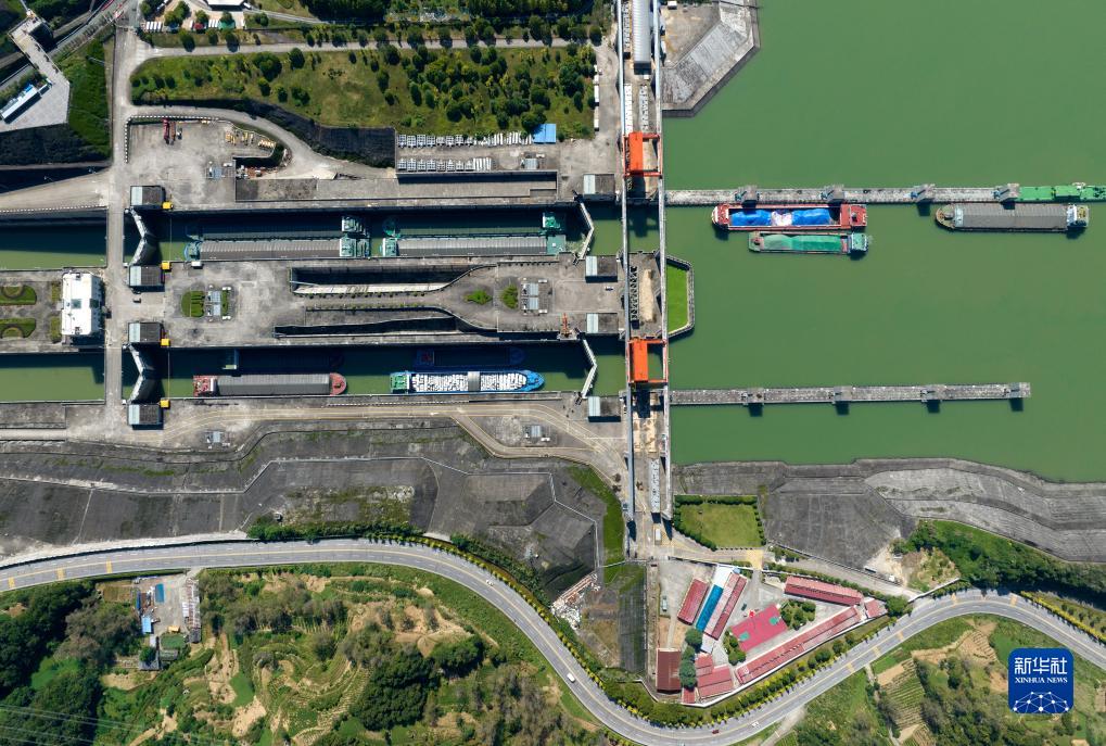 10月8日,在湖北省宜昌市,船舶有序通過(guò)三峽雙線(xiàn)五級船閘(無(wú)人機照片)。