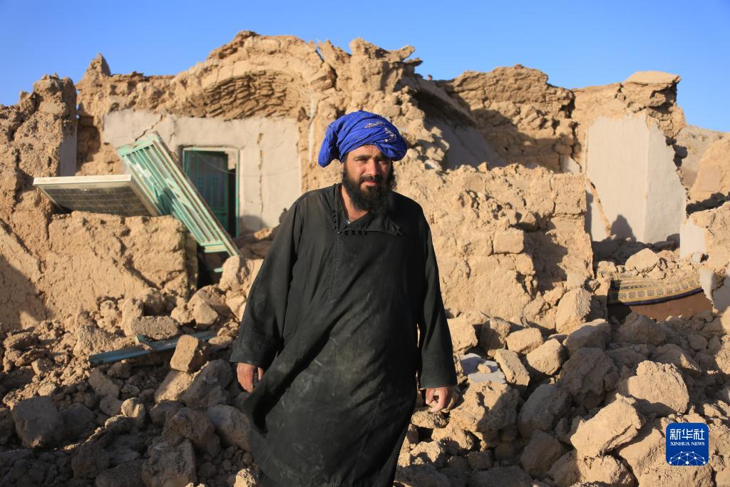 10月8日,一名村民站在阿富汗赫拉特省津達詹區震后坍塌的房屋前。