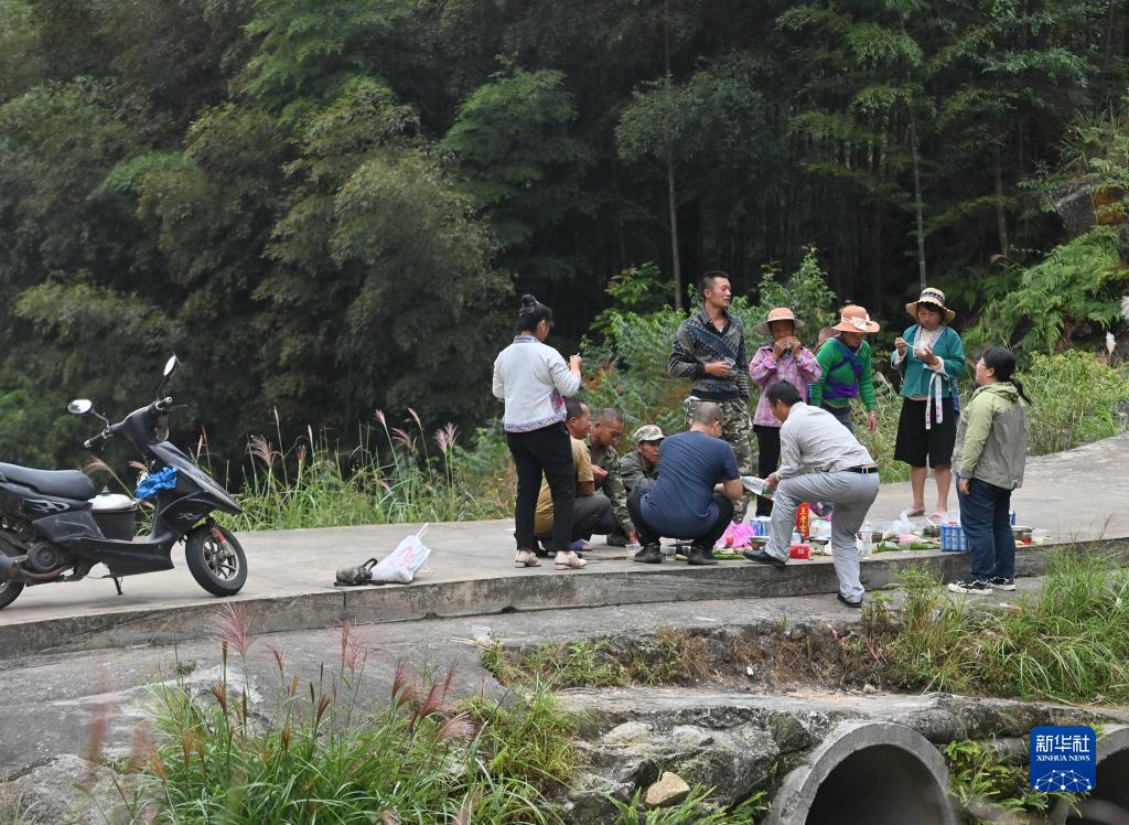 楊寧(右一)和鄰村(吉曼村)村民們在田邊一邊吃午飯,一邊協(xié)商山泉水引水工程相關(guān)事宜(10月8日攝)。新華社記者 黃孝邦 攝