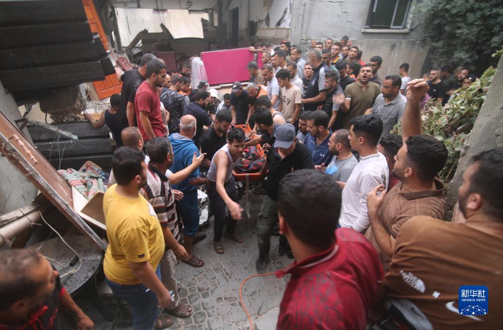 10月9日,在加沙地帶南部城市拉法,人們從以色列空襲后的建筑中抬出一名搜尋到的受害者。