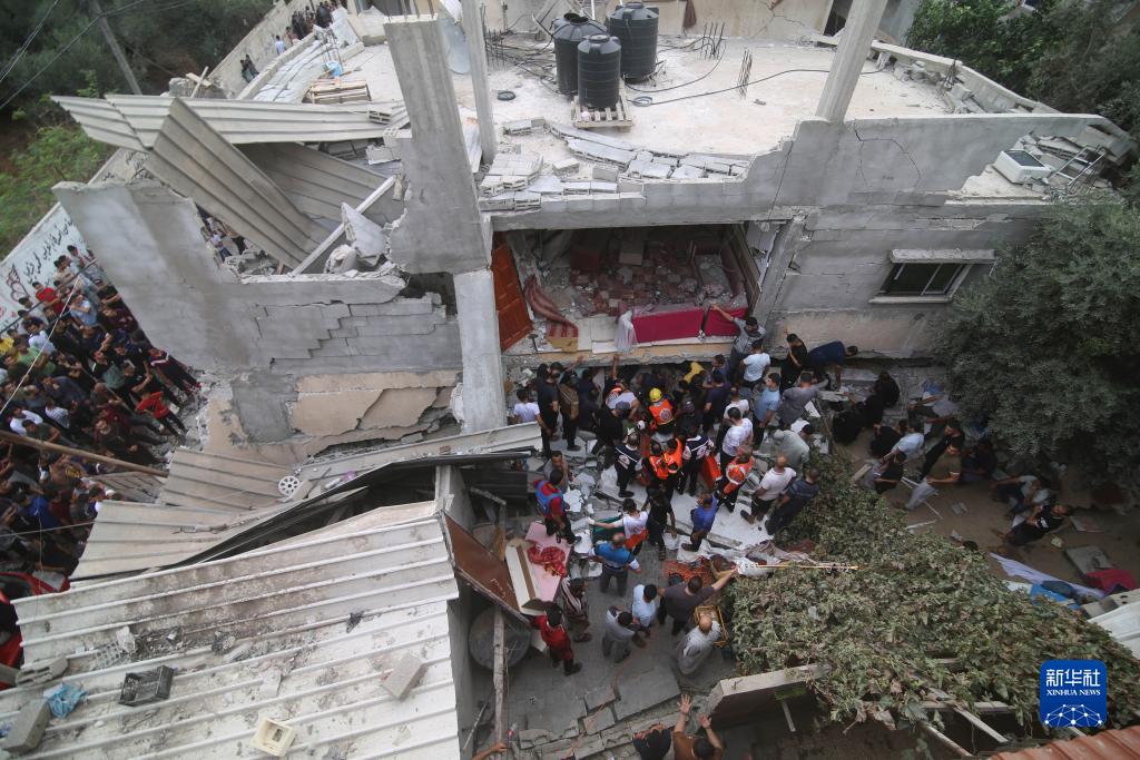 10月9日,在加沙地帶南部城市拉法,人們從以色列空襲后的建筑中抬出一名搜尋到的受害者。