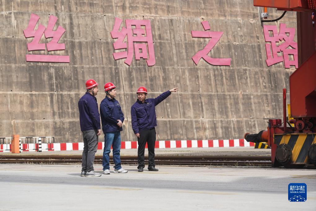 5月10日,在中哈連云港物流合作基地,來(lái)自哈薩克斯坦的連云港中哈國際物流有限公司副總經(jīng)理阿孜(中)、業(yè)務(wù)員馬合江(左)和中方同事交流。