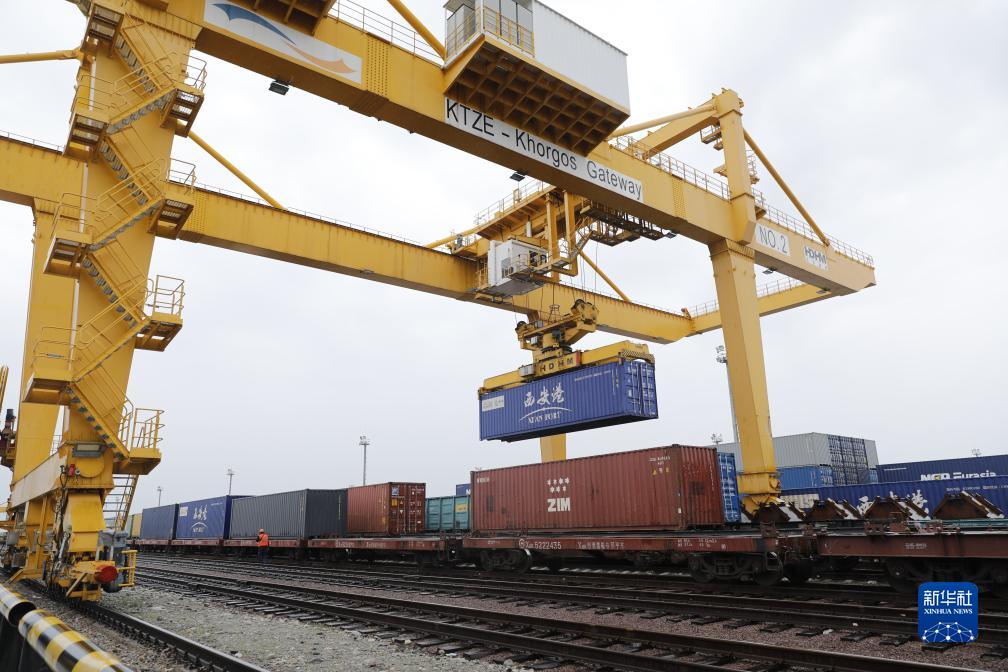2022年5月19日,在哈薩克斯坦南部中哈邊境地區的“霍爾果斯-東大門(mén)”無(wú)水港內,龍門(mén)吊正在工作。