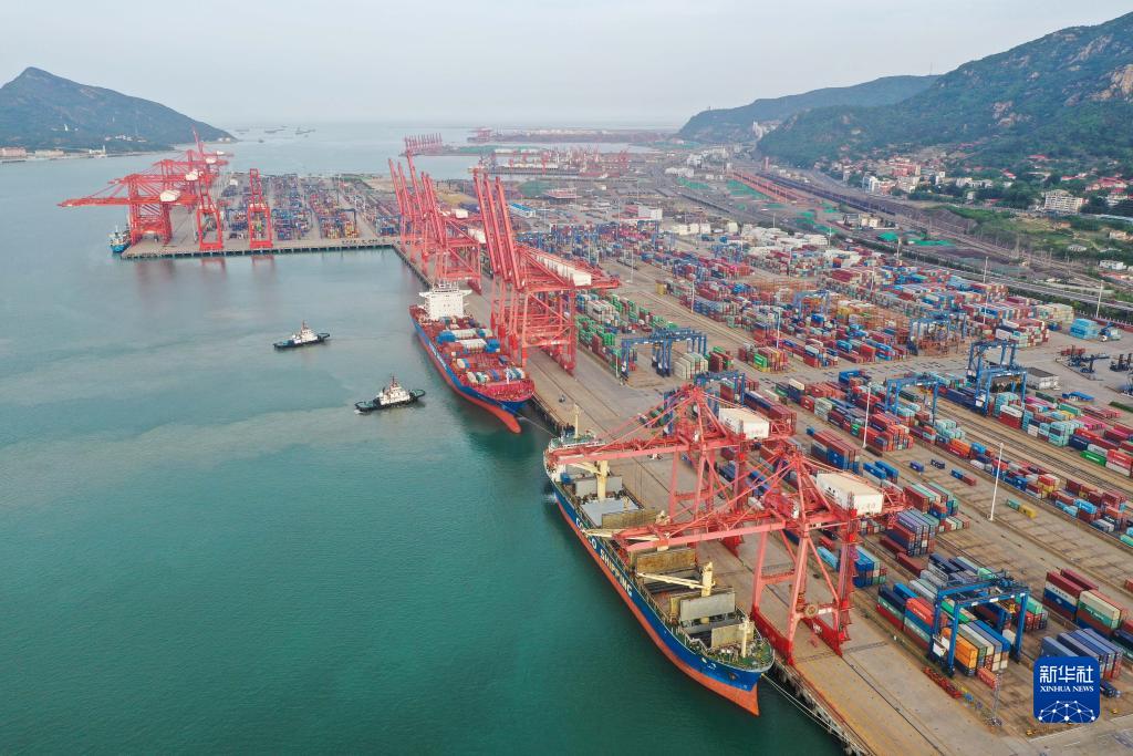 5月9日,貨輪??吭谶B云港港集裝箱碼頭(無(wú)人機照片)。