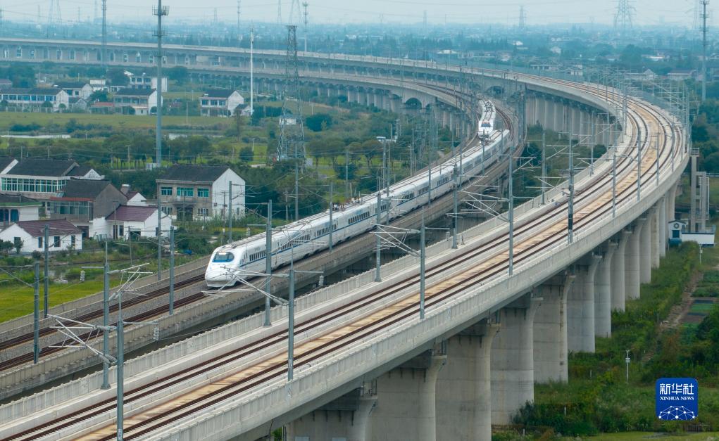 10月10日,列車(chē)行駛在滬蘇通鐵路江蘇省太倉市境內(無(wú)人機照片)。