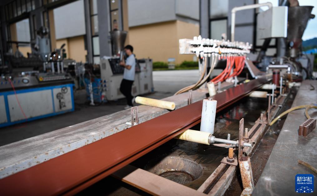 在廣東廣寧縣一家公司車(chē)間拍攝的竹纖維板材擠壓生產(chǎn)線(xiàn)(10月9日攝)。