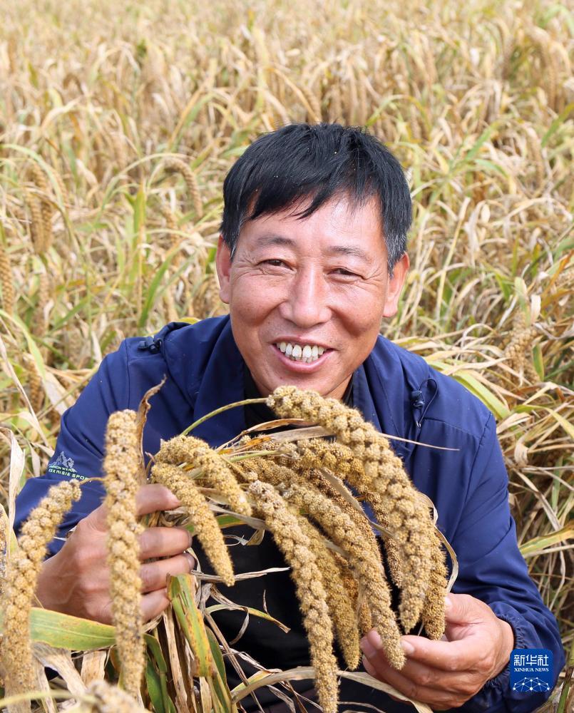 10月10日,在河南省洛陽(yáng)市汝陽(yáng)縣蔡店鄉蟒莊村高標準農田谷子地,農民手捧豐收的谷子喜笑顏開(kāi)。