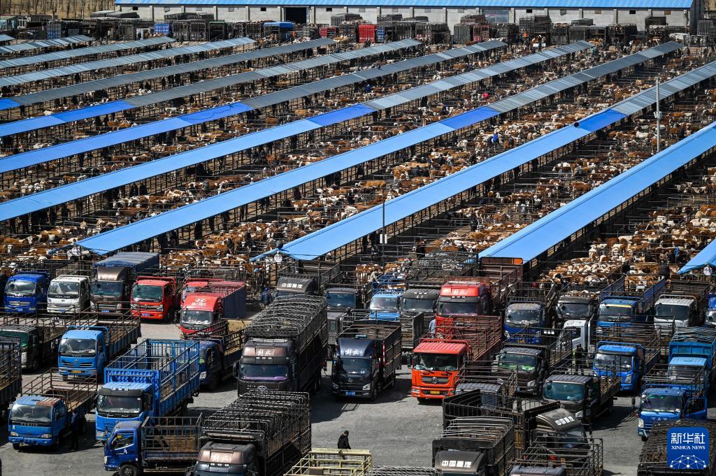 這是繁忙的內蒙古通遼市科爾沁左翼中旗舍伯吐鎮成峰牲畜交易市場(chǎng)(2023年4月12日攝)。