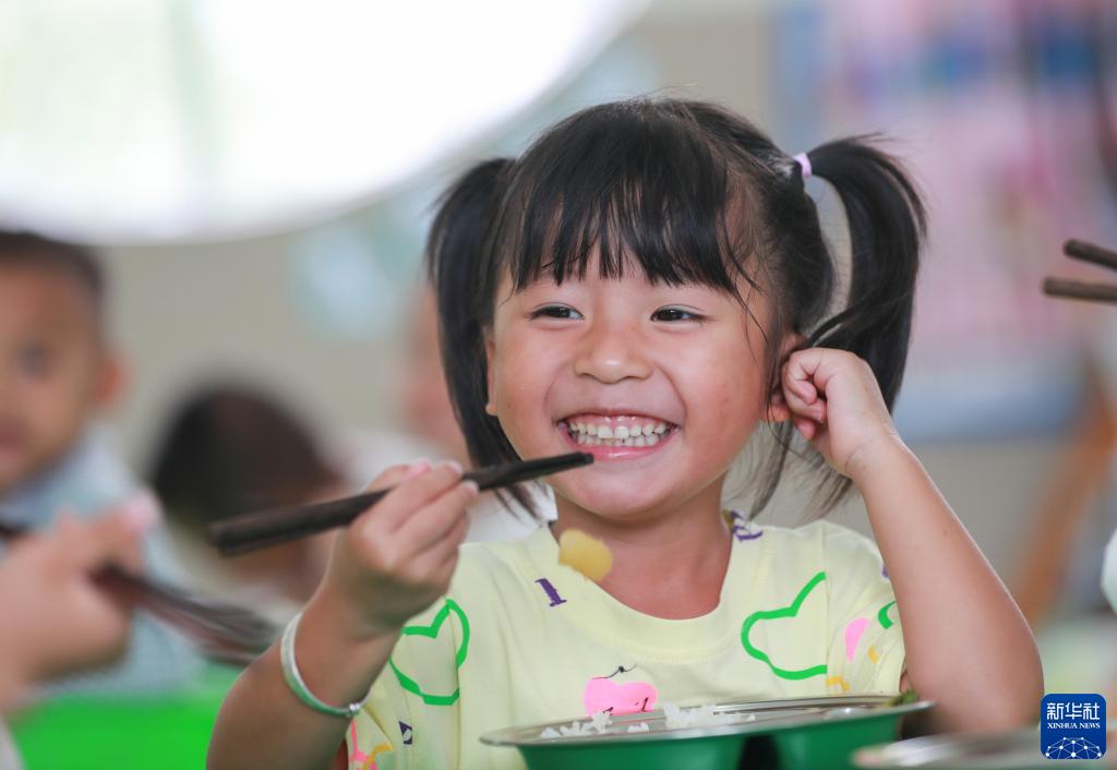 貴州省從江縣剛邊壯族鄉中心幼兒園的小朋友在享用免費營(yíng)養午餐(2023年9月15日攝)。近年來(lái),多地持續推進(jìn)農村學(xué)生營(yíng)養午餐關(guān)愛(ài)工程、免費午餐等項目,針對當地學(xué)生的膳食習慣,科學(xué)合理搭配菜品、果品,切實(shí)提高膳食結構和質(zhì)量,確保學(xué)生吃得飽、吃得好,保障學(xué)生健康快樂(lè )。