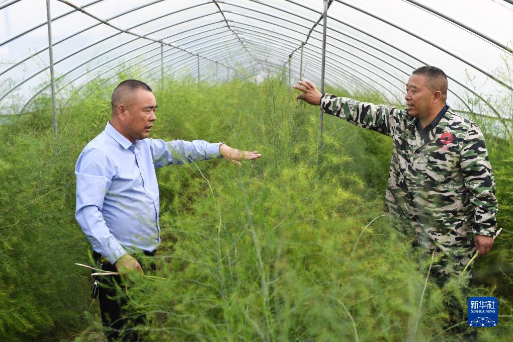 10月11日,在漣水縣紅窯鎮金城村,淮安市人大代表鄭標(左)給蘆筍種植戶(hù)傳授管護知識。鄭標是當地蘆筍種植大戶(hù),帶領(lǐng)許多村民走上種植蘆筍之路。