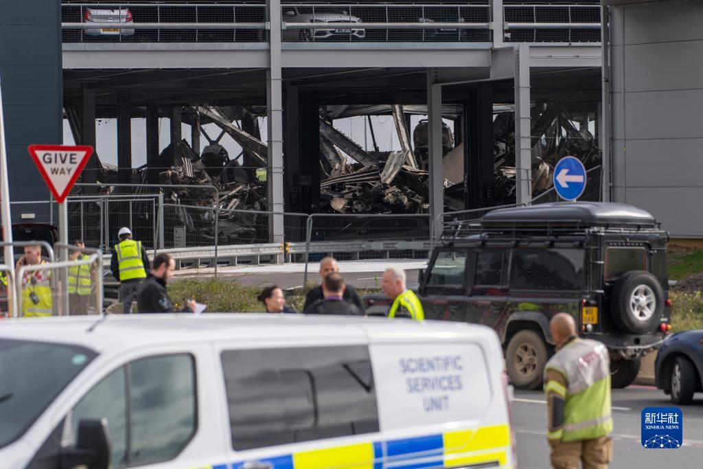 10月11日,在英國倫敦盧頓機場(chǎng),工作人員在失火停車(chē)場(chǎng)附近工作。