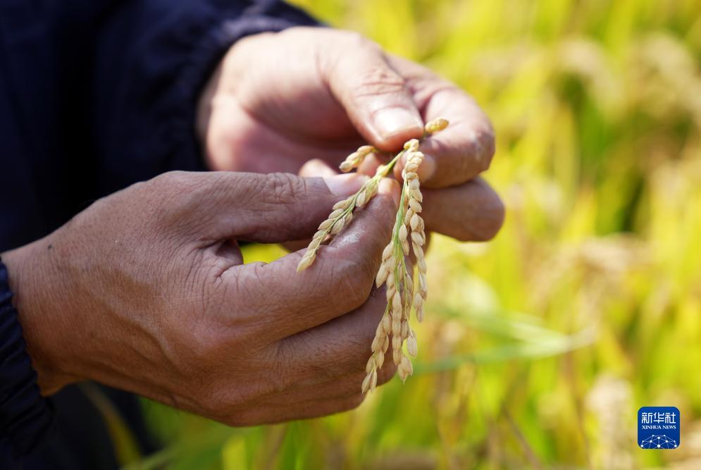 10月11日,農業(yè)科研人員在河北省唐山市曹妃甸區第五農場(chǎng)鹽堿地改良而成的高標準稻田查看稻粒的飽滿(mǎn)度。