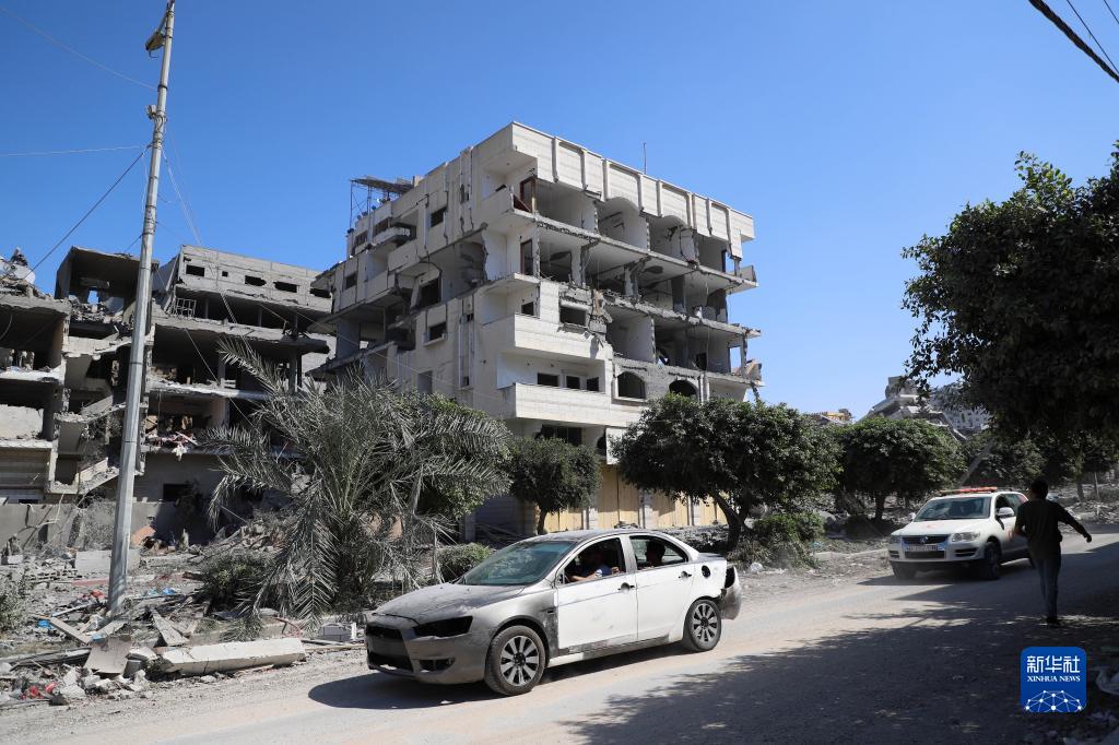 10月13日,在加沙城,人們駕車(chē)經(jīng)過(guò)遭以色列空襲損毀的建筑。