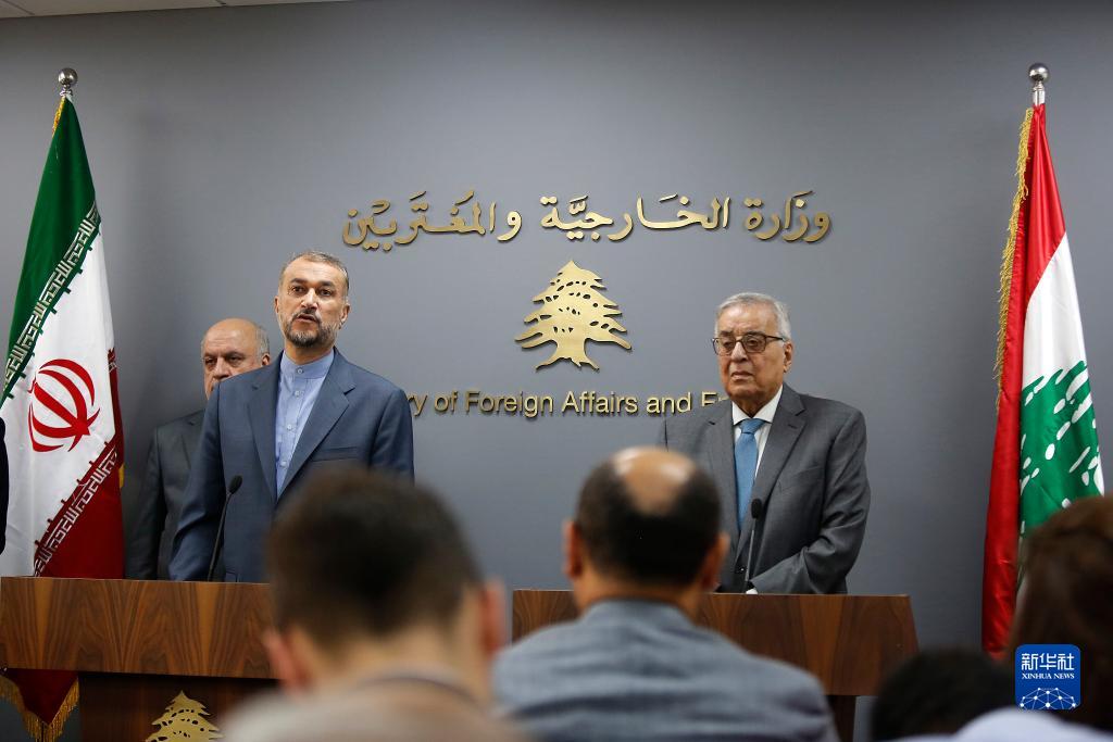 10月13日,伊朗外長(cháng)阿卜杜拉希揚(左)和黎巴嫩外長(cháng)哈比卜在黎巴嫩首都貝魯特出席記者會(huì )。