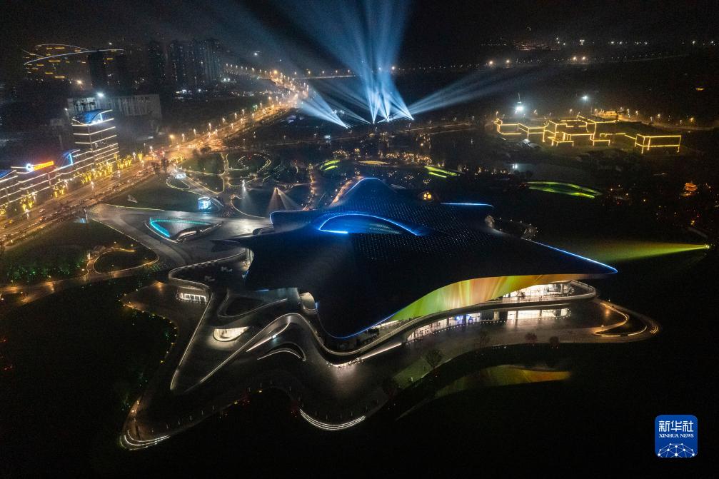 這是10月16日晚拍攝的2023成都世界科幻大會(huì )主場(chǎng)館——成都科幻館(無(wú)人機照片)。