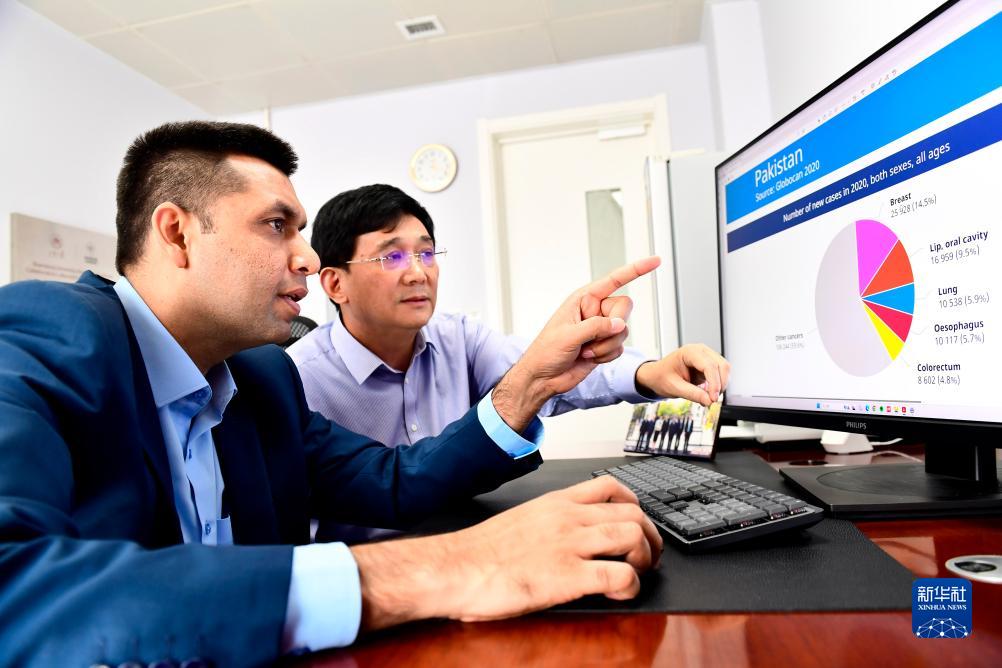 10月16日,在山東大學(xué)齊魯醫學(xué)院,默罕默德·沙巴茲向賈繼輝教授介紹癌癥在巴基斯坦的病發(fā)情況。