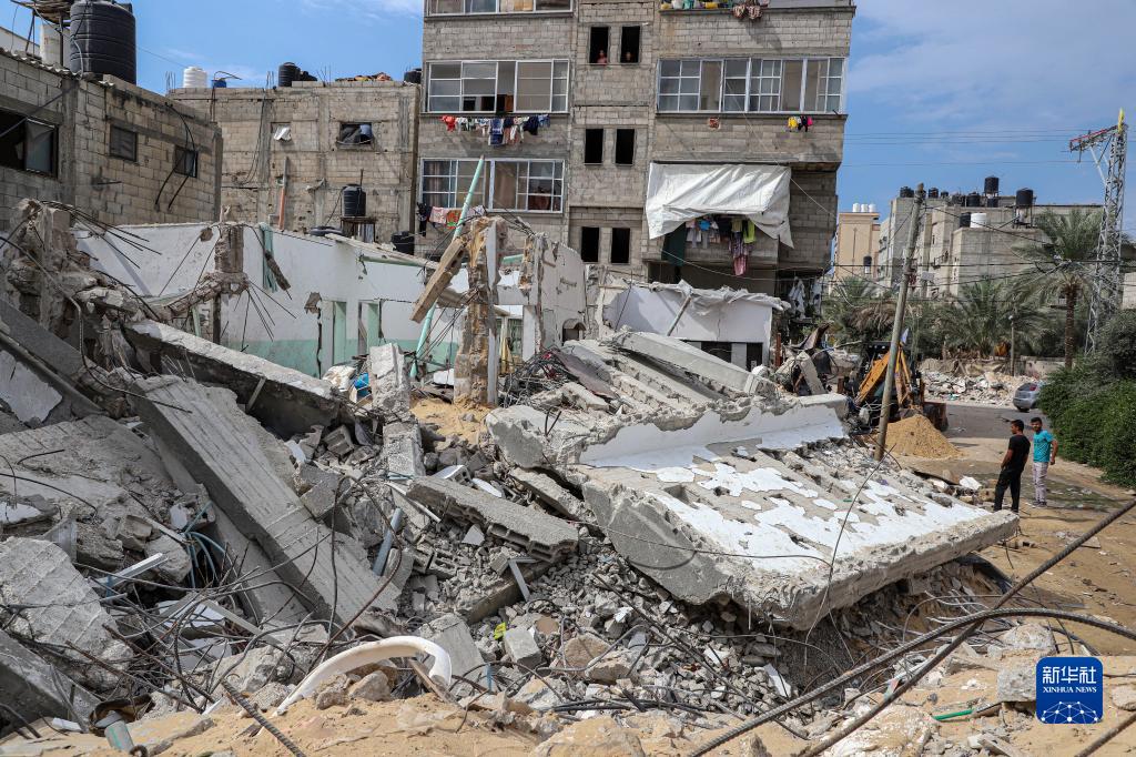 10月16日,在加沙地帶南部城市汗尤尼斯,人們查看遭以色列空襲損毀的建筑。