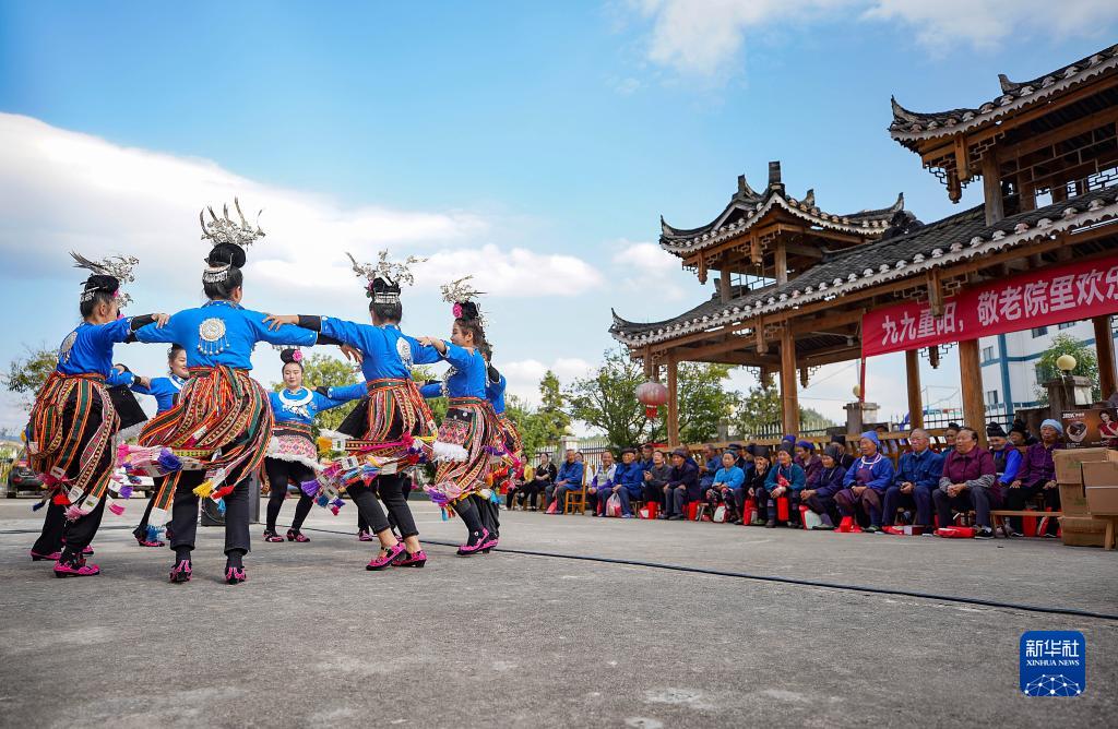 10月23日,在貴州省黔東南苗族侗族自治州丹寨縣揚武鎮敬老院,志愿者為老人們表演苗族傳統舞蹈。