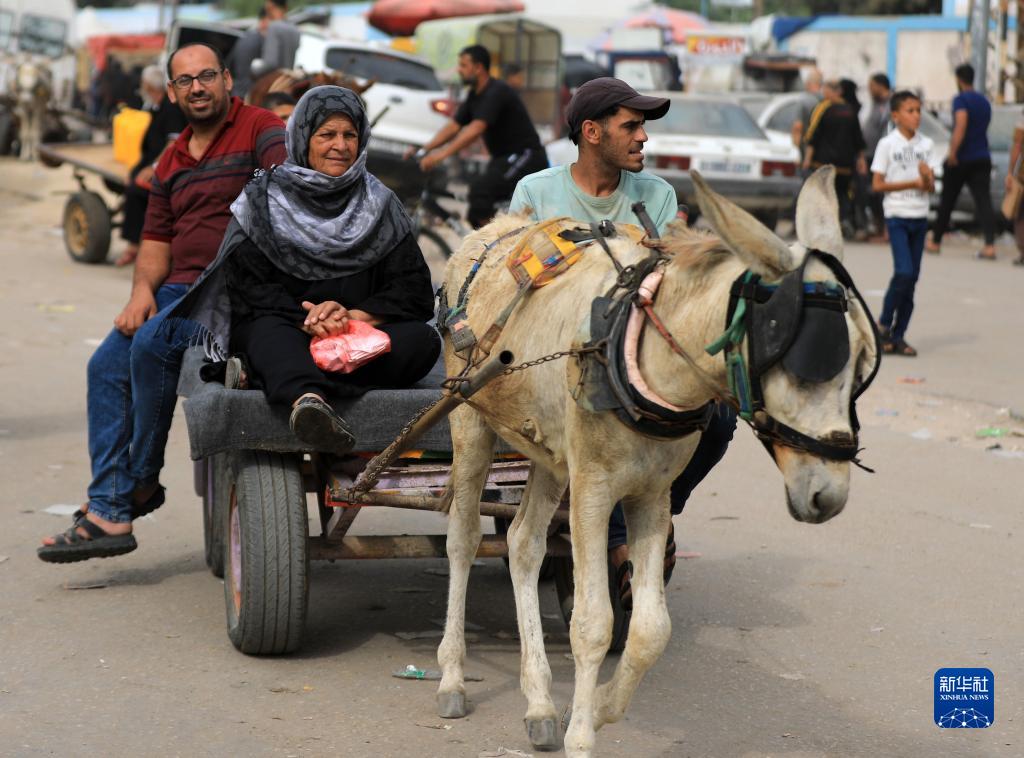 10月29日,因缺乏燃料,人們在加沙地帶南部城市汗尤尼斯使用驢車(chē)出行。