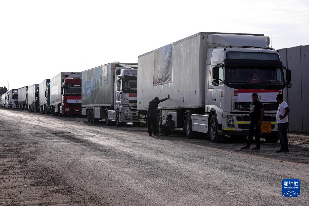 數百輛載有救援物資的卡車(chē)在拉法口岸埃及一側等待進(jìn)入加沙。
