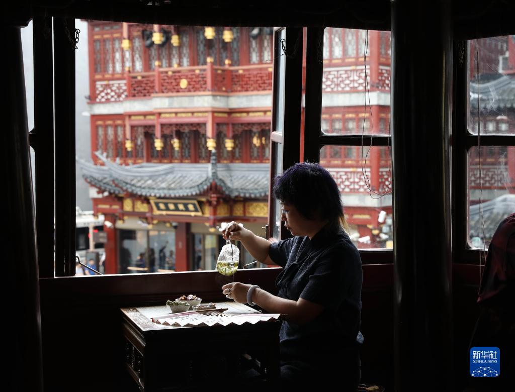 10月12日,人們在上海豫園九曲橋湖心亭茶樓喝茶。湖心亭茶樓是上?,F存最古老的茶樓。