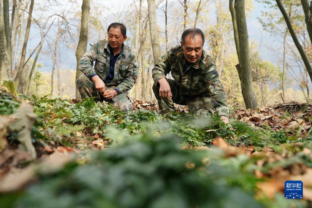 11月2日,技術(shù)人員在鎮坪縣城關(guān)鎮友誼村黃連林下經(jīng)濟示范園內查看黃連長(cháng)勢。
