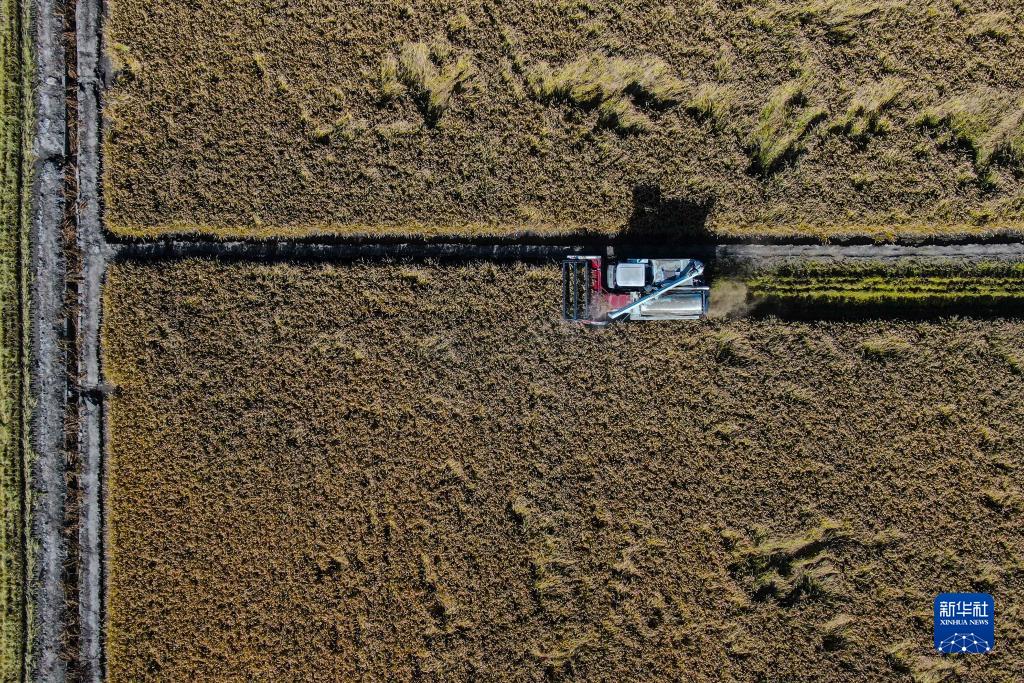11月3日,農戶(hù)駕駛農業(yè)機械在盤(pán)錦市大洼區王家街道興海村收割水稻(無(wú)人機照片)。