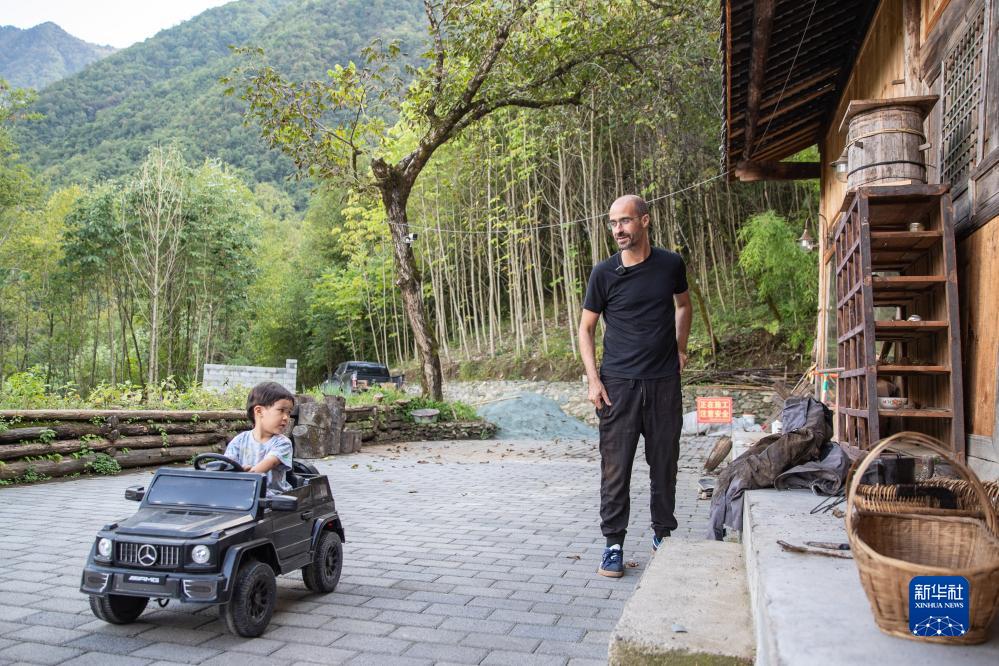 9月15日,在重慶市城口縣北屏鄉松柏村,文森在工作室做割漆前的準備工作時(shí),與孩子互動(dòng)。
