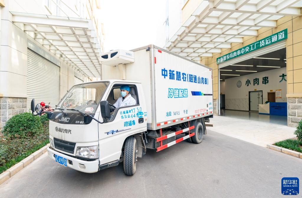 11月3日,在昭通市昭陽(yáng)區中新慧農供應鏈小肉串中央工廠(chǎng),工作人員駕駛冷鏈車(chē)運輸小肉串。