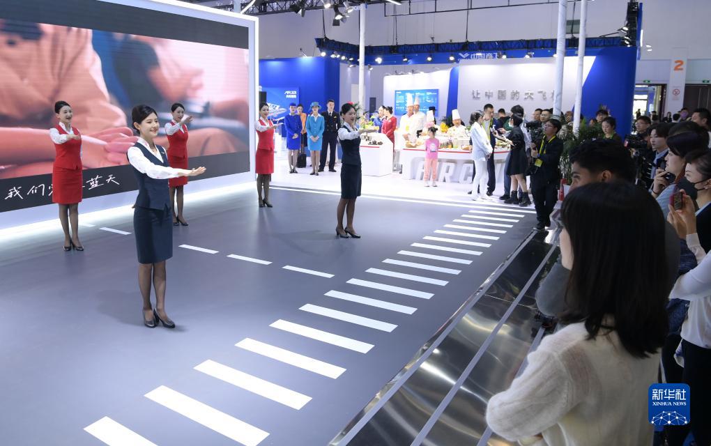 11月3日,來(lái)自中國國際航空公司的空乘人員在展臺進(jìn)行手語(yǔ)表演。