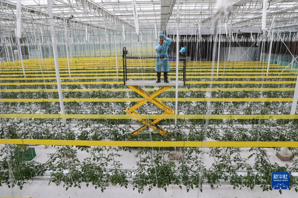11月4日,在南通市通州區十總鎮的圓宏萬(wàn)嘉智慧農場(chǎng),技術(shù)員給番茄苗“盤(pán)頭”。
