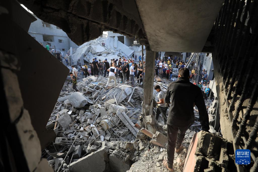 11月5日,在加沙地帶中部的代爾拜拉赫,人們查看遭以色列轟炸后的邁加齊難民營(yíng)。