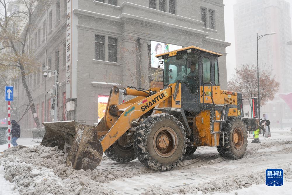 11月6日,一輛鏟車(chē)在哈爾濱中央大街上鏟除積雪。