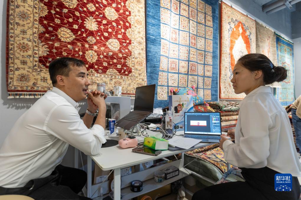 11月4日,在綠地全球商品貿易港內開(kāi)設阿富汗國家進(jìn)口館,阿里(左)和員工討論訂單設計。