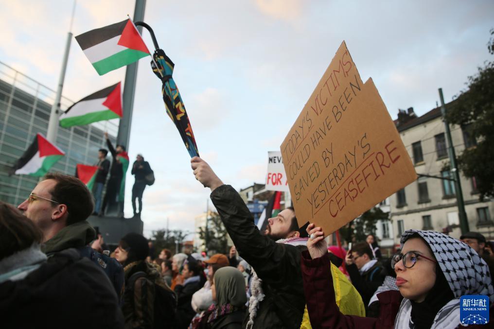 當日,眾多巴勒斯坦支持者在比利時(shí)布魯塞爾集會(huì ),呼吁盡快實(shí)現加沙?;?。