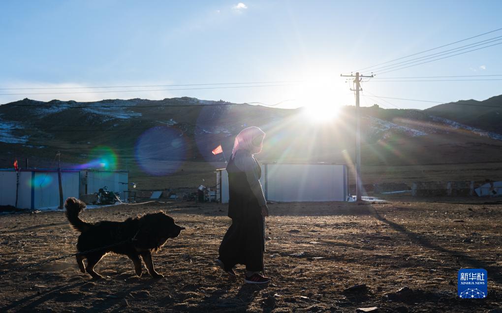 在西藏當雄縣納木湖鄉達布村的冬季放牧點(diǎn),牧民在和藏獒玩耍(11月10日攝)。