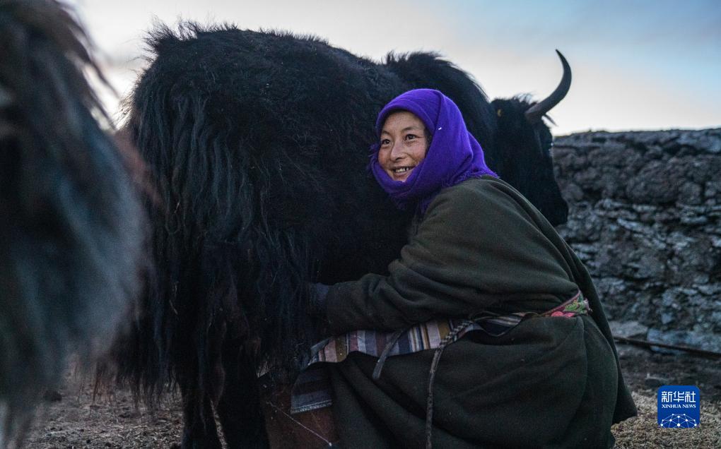 在西藏當雄縣納木湖鄉達布村的冬季放牧點(diǎn),云丹的妻子同吉在擠牛奶(11月10日攝)。