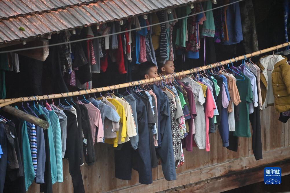 在烏英苗寨,兩個(gè)小朋友在看窗外的風(fēng)景(2023年10月14日攝)。