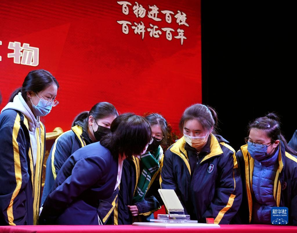 2022年1月4日,中共一大紀念館的工作人員帶著(zhù)館藏的革命文物——1949年5月華東軍區司令部在解放上海前夕印制的《入城紀律》冊子,走進(jìn)上海市格致中學(xué),給師生們上了生動(dòng)而難忘的“新年第一課”。這是中共一大紀念館的文物保管人員與觀(guān)看文物的學(xué)生交流。新華社記者 劉穎 攝