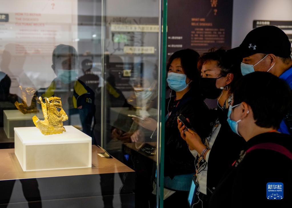 2021年三星堆遺址3號“祭祀坑”出土的金面具,在四川省廣漢市三星堆博物館開(kāi)放式文物修復館內展出,吸引眾多參觀(guān)者(2021年10月29日攝)?!⌒氯A社記者 劉潺 攝