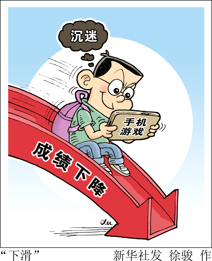 河南省鹿邑縣初中學(xué)生靳博的父母在浙江打工。為了方便聯(lián)系,父母為他買(mǎi)了一部手機。靳博的爺爺告訴記者:“沒(méi)想到買(mǎi)了手機后,他天天打游戲,家里誰(shuí)也管不住?!苯┏撩杂谟螒蚝?,學(xué)習成績(jì)也一落千丈。