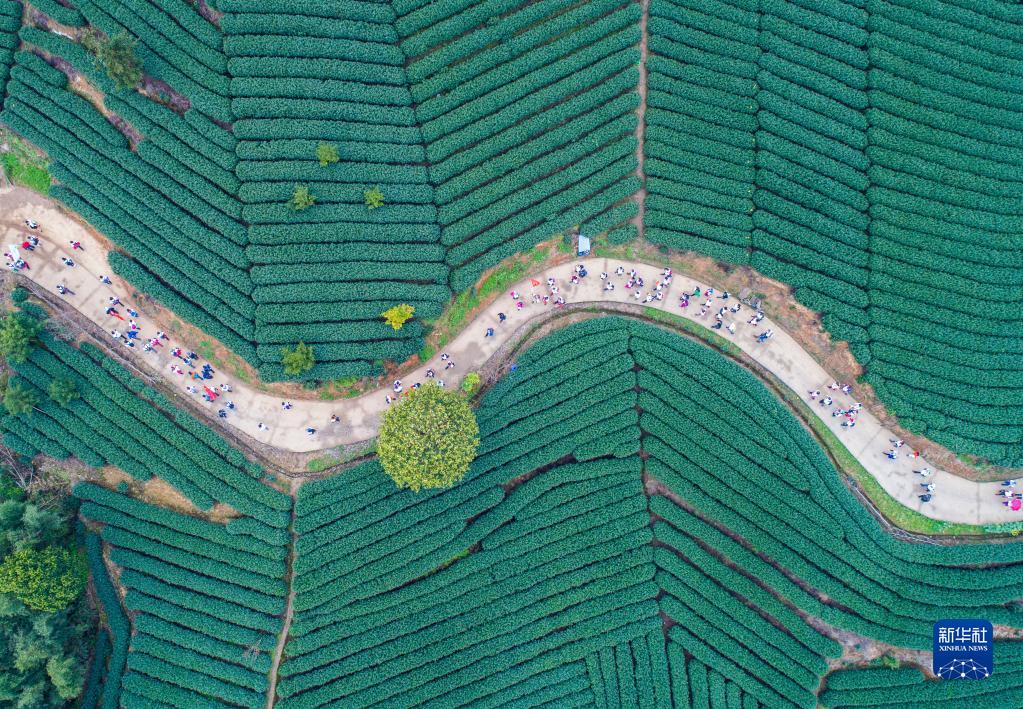 團隊游客在杭州市富陽(yáng)區拔山村萬(wàn)畝茶山游覽(2018年3月26日攝,無(wú)人機照片)。浙江省“千村示范、萬(wàn)村整治”工程撬動(dòng)了鄉村從美麗生態(tài)到美麗經(jīng)濟,再到美好生活的良性循環(huán)。2018年,浙江“千萬(wàn)工程”獲得聯(lián)合國“地球衛士獎”中的“激勵與行動(dòng)獎”。新華社記者 徐昱 攝