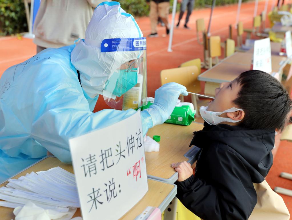 檢測人員為上??党蔷用襁M(jìn)行核酸采樣(新華社記者劉穎攝)